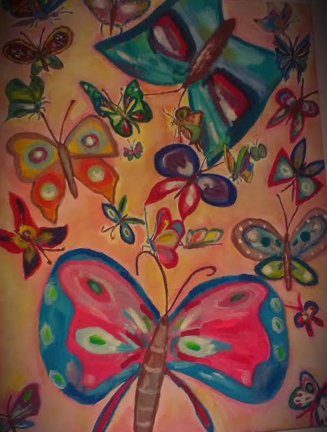 De sarbatori, in vacanta, le-am propus sa facem ceva artistic impreuna. Pentru ca inca avem pereti goi prin casa, am cumparat de la Hornbach doua panze mari. Vopsele acrylice si pensule de toate dimensiunile aveam deja, fiindca le-am mai folosit cu alta ocazie (despre asta, intr-o postare viitoare). Le-am lasat pe fete sa creioneze fluturi pe una din panze, iar de cea de-a doua, ne-am ocupat eu si Catalin. Dupa cam o saptamana de munca asidua, pe panza fetelor sedeau cuminti o multime de fluturi, de toate dimensiunile, formele si culorile. Le-am mai cizelat formele pe ici, pe colo, am facut eu fondul, pe care am incercat sa-l asortez cu fondul celuilalt tablou si, dupa inca o saptamana, iata rezultatul final:)