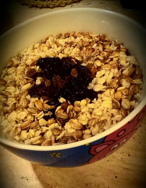 Apoi fierb apa, pe care o torn in bolul cu cereale integrale, cat sa le acopere cu 3-4 degete. Combin de obicei doua tipuri de cereale (orz cu ovaz sau grau cu secara, hrisca -cea de culoare verzuie, neprocesata), in functie de ce avem prin casa. Uneori, adaug cateva stafide deshidratate.