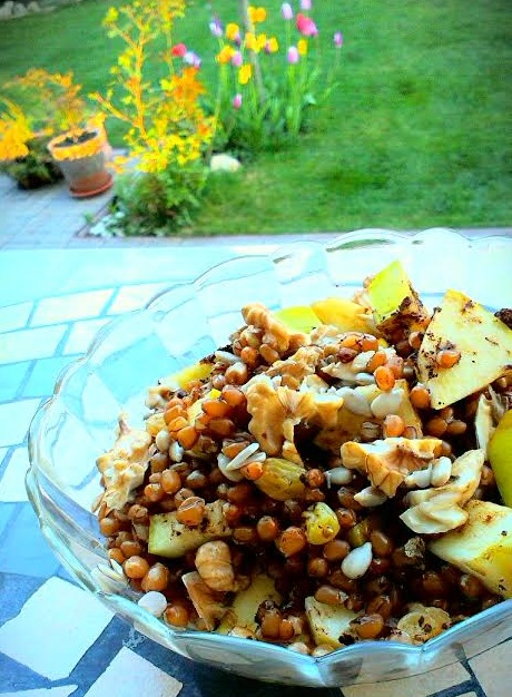 Imi doream de multa vreme sa incerc aceasta reteta (nu mai stiu daca am citit-o pe undeva sau pur si simplu mi-era dor de coliva de la sat, pe care o mancam in copilarie), asa ca am achizitionat boabe de grau si am purces la hidratat. Minim 12 ore. Am fiert apoi graul vreo ora si jumatate, timp in care in casa se imprastiase un minunat miros de paine, prajituri, gogosi…ce mai, un miros imbietor si curat. Fetele mele se foiau pe langa cratita, dornice sa guste. 🙂