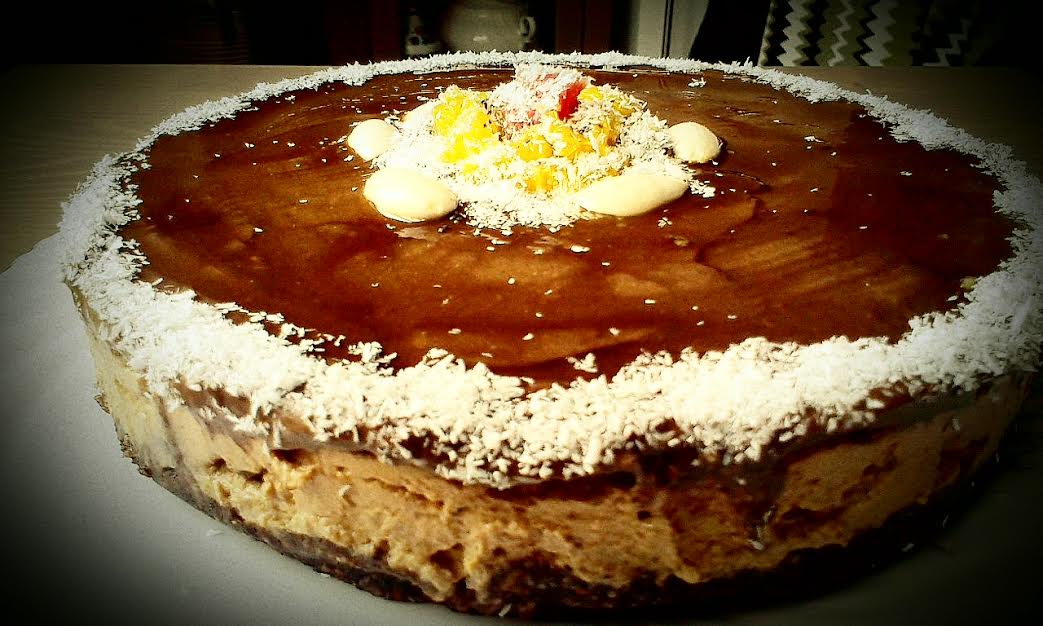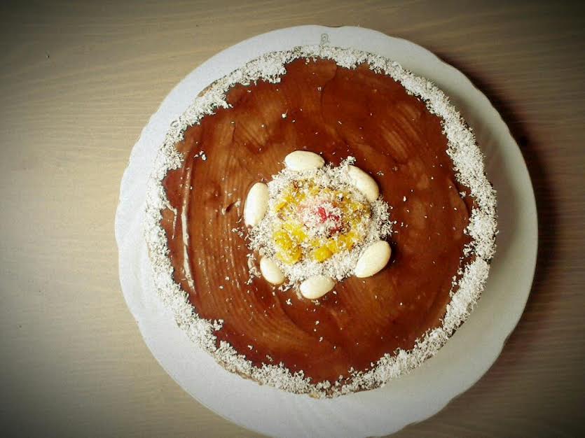 De dimineata, am pregatit topping-ul, pregatit dintr-un avocado curatat frumusel si pus in blender, impreuna cu lapte de susan (facut din 12 linguri de seminte de susan si aprox. 1 litru de apa, date impreuna la blender si apoi strecurata pulpa de susan). Am adaugat apoi carobul, mierea si pudra de vanilie. A rezultat o crema fina, numai buna de intins peste tortul din care fumegau aburi reci. Am adaugat la final firisoare de miere, pentru un aspect lucios. Am scos tortul din forma, ornand cu cateva bucatele de portocala, migdale curatate de coaja si fulgi de cocos.