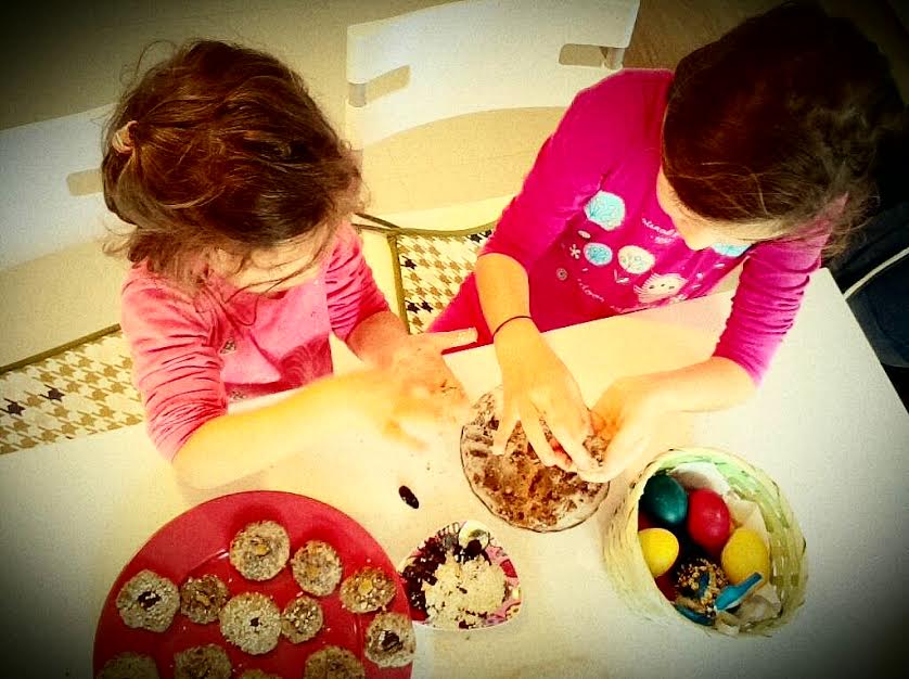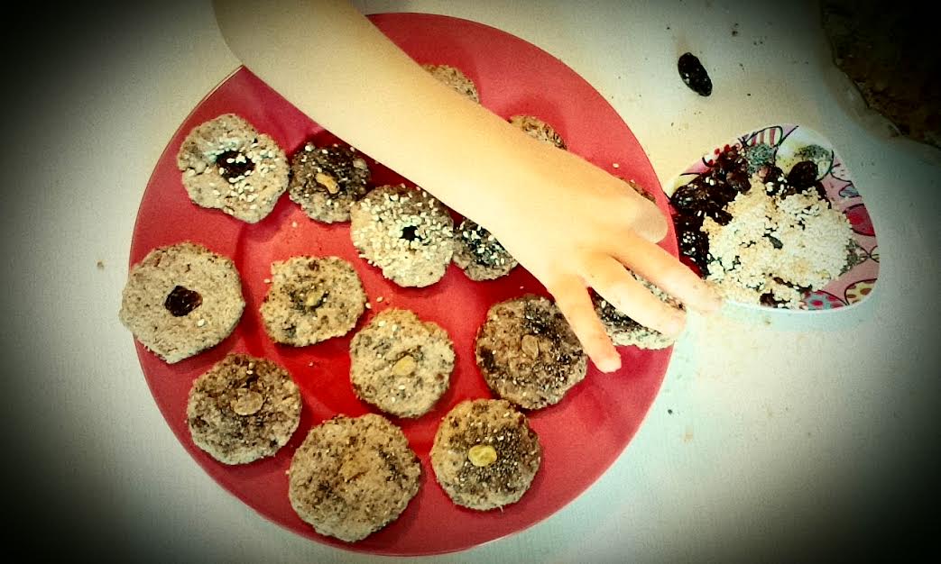 Apoi am chemat ajutoare; patru manute mici si gingase, dornice sa ajute, au trecut la facut biscuiiiiitiiiii, tavaliti in susan, stafide, mac si chia. 🙂