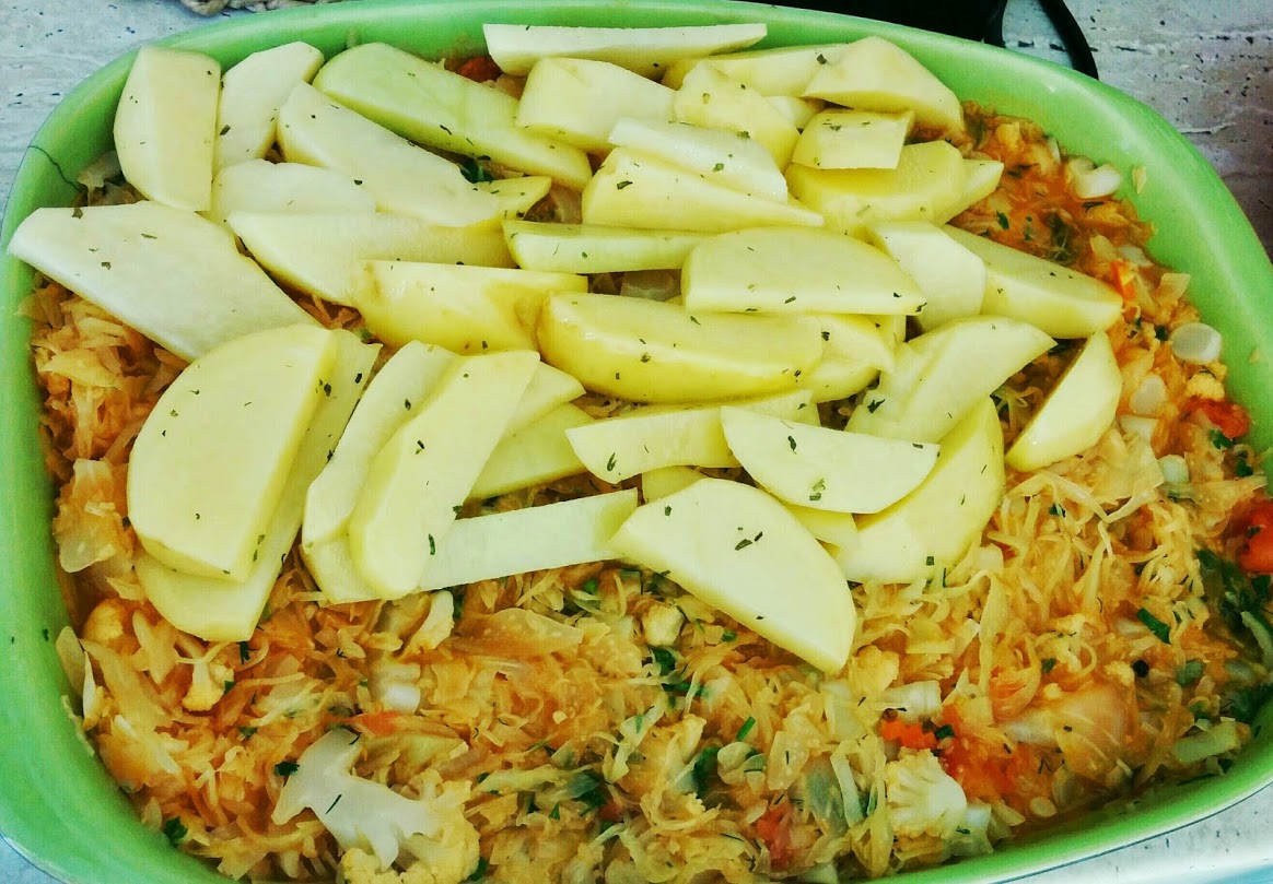 Mod de preparare: cepele si ardeii, taiati marunt, se pun in cratita cu un pic de apa, pana dau un pic in fiert; apoi se adauga varza si conopida murata (pentru un pic de acreala) si se lasa sa se moaie, la foc mic; se adauga si sarea, boabele de piper si foile de dafin, impreuna cu jumatate de cana de suc de rosii de la Mama Aurelia, sora mamei. Cand s-a muiat varzica, se adauga verdeata, se amesteca bine si apoi se transfera intr-o tava rezistenta la temperaturi inalte. Peste varza se adauga cativa cartofi taiati pe lung si tavaliti prin condimente si se da totul la cuptor, pana ce se moaie si se rumenesc cartofii. Bunatate mare! 🙂