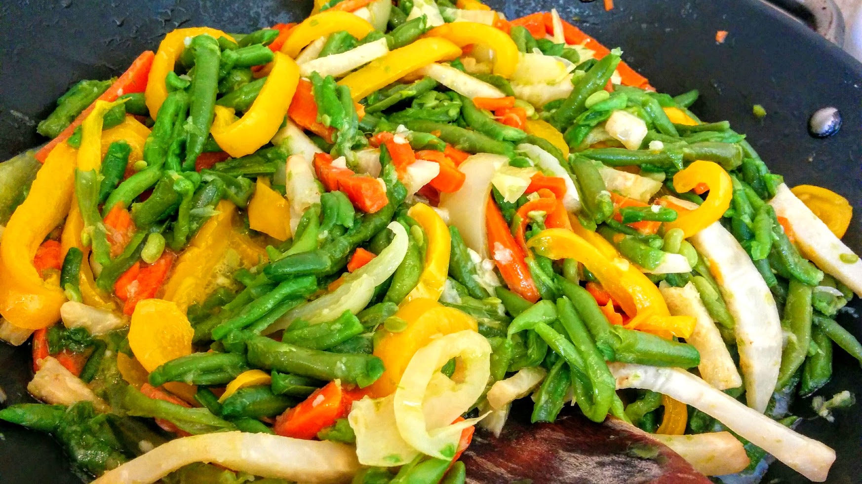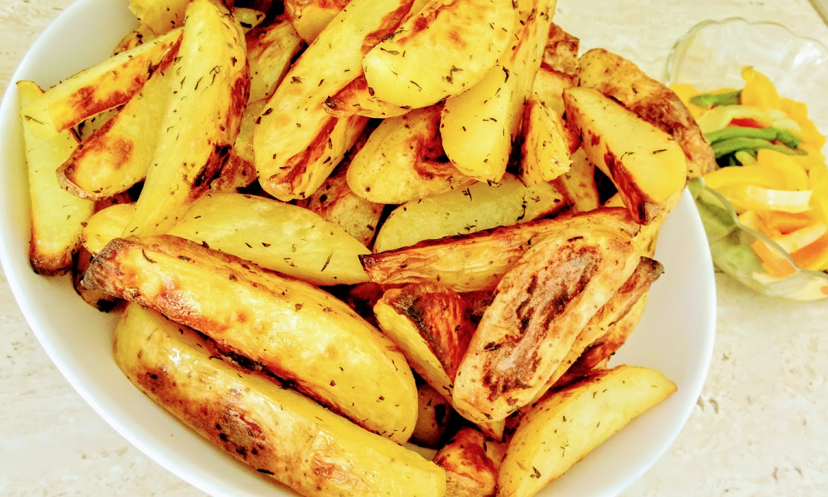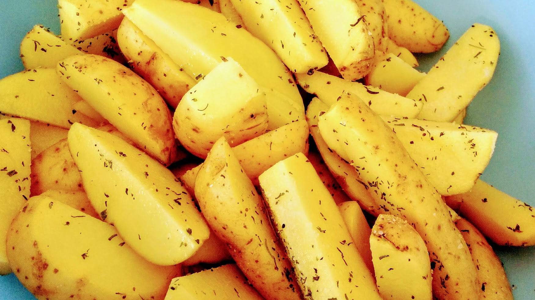 Mod de preparare: se pun legumele taiate ca in imagini, in wok, fie cu putina apa, fie cu un pic de ulei si se lasa la foc mic sa se inmoaie. Intre timp, se spala bine, bine cartofii (noi i-am lasat in coaja), se taie pe lung si se tavalesc bine prin nitica sare si condimente (dupa preferinta). Se pun in tava de la cuptor si se baga la caldurica, pana prind culoare.