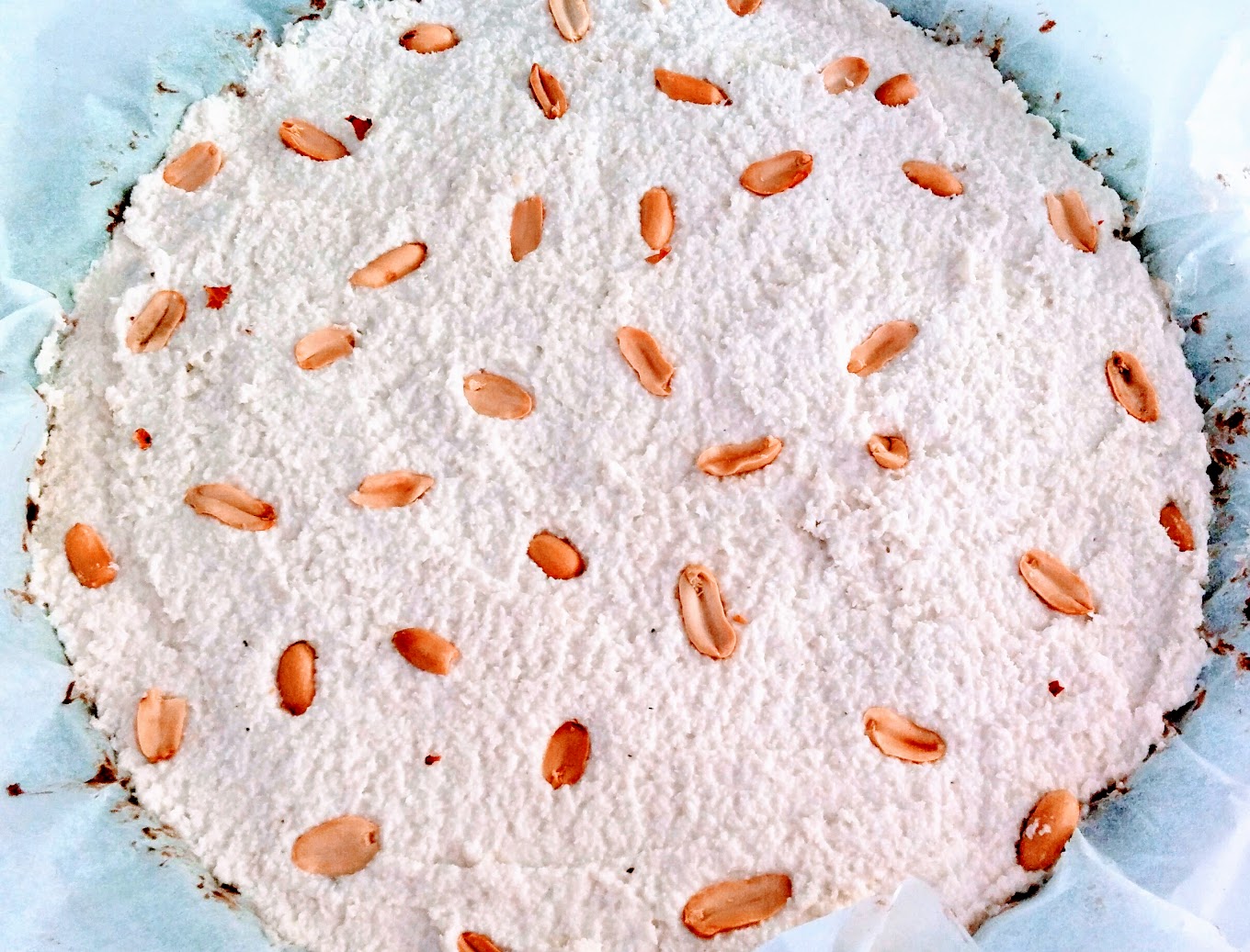 Jumatate din crema de caju am pus-o peste crema de nuca de cocos si am mai invartit putin compozitia in blender, pana ce s-au omogenizat bine, bine. Crema rezultata am asezat-o peste blatul scos din frigider, intanzand-o cat mai uniform. Cu gandul la ciocolata Snickers (care stiu ca le place mult copiilor), am presarat peste crema de caju si nuca de cocos, cateva alune coapte.