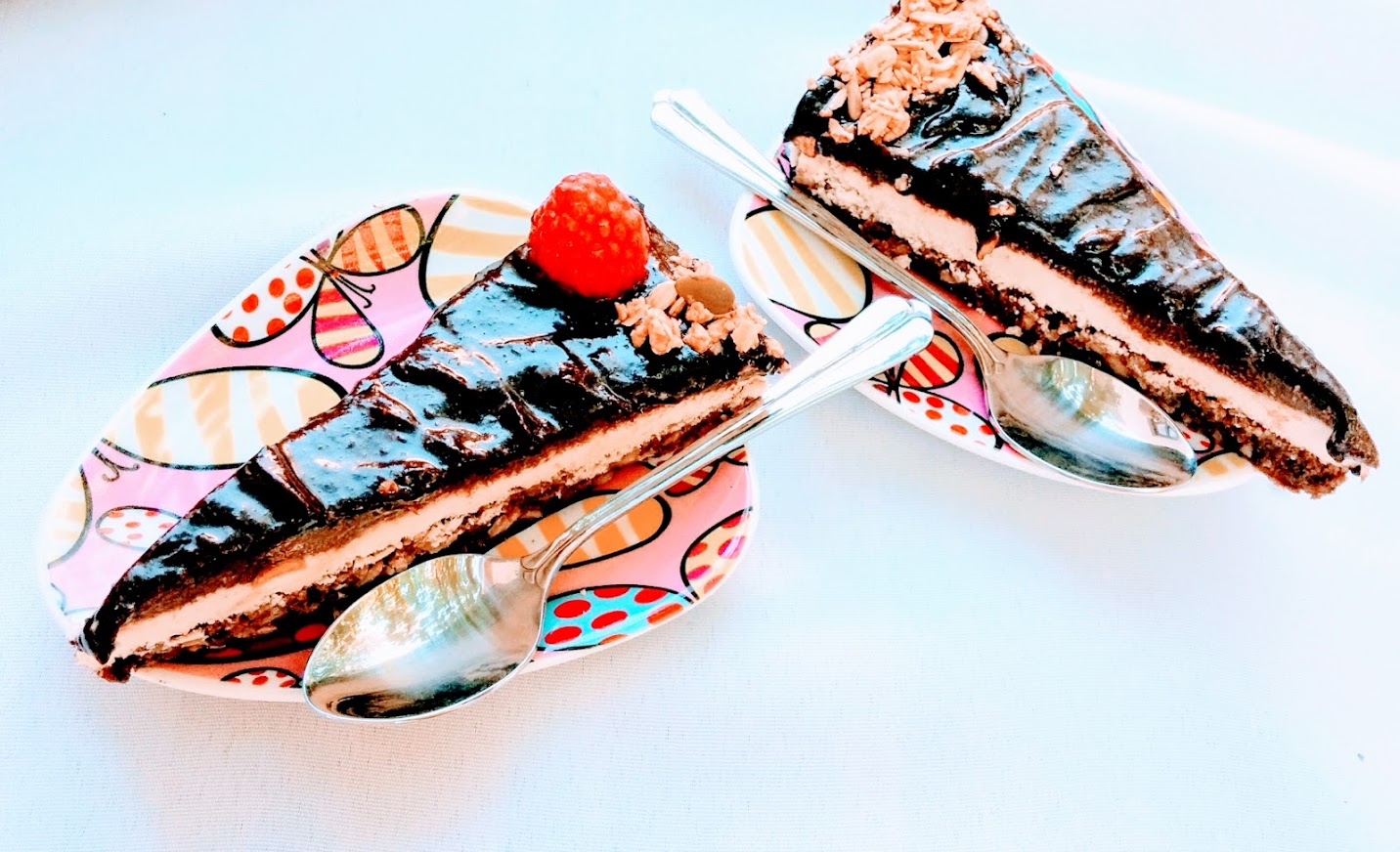 Cu 2 ore inainte de a sosi musafirii, am mutat din congelator tortul in frigider, nu inainte de a-l scoate cu grija din forma de tort si de a-l aseza pe un platou. Inainte de feliere, l-am ornat cu inca un strat subtire de ciocolata, facuta repejor din 2 linguri de peanut butter, in care am adaugat 1 lingurita de miere si 2 linguri de carob. Am subtiat crema cu apa calduta, omogenizand bine compozitia.