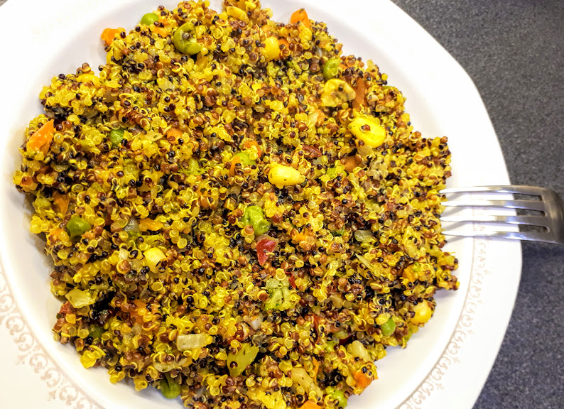 Pana acum, am folosit quinoa mai mult in retete – desert. De ceva vreme, o gatesc si cu legume si sunt tare incantata de gustul, de textura si de satietatea pe care o da acest preparat…Ne bucuram cu totii de un curcubeu de culori si de ingrediente sanatoase. O reteta care se gateste cu minim de efort si ofera multa savoare. Quinoa se poate poate adauga pur si simplu in salate. Pentru iubitorii de gusturi “tari”, se poate folosi putin mujdei de usturoi. 🙂