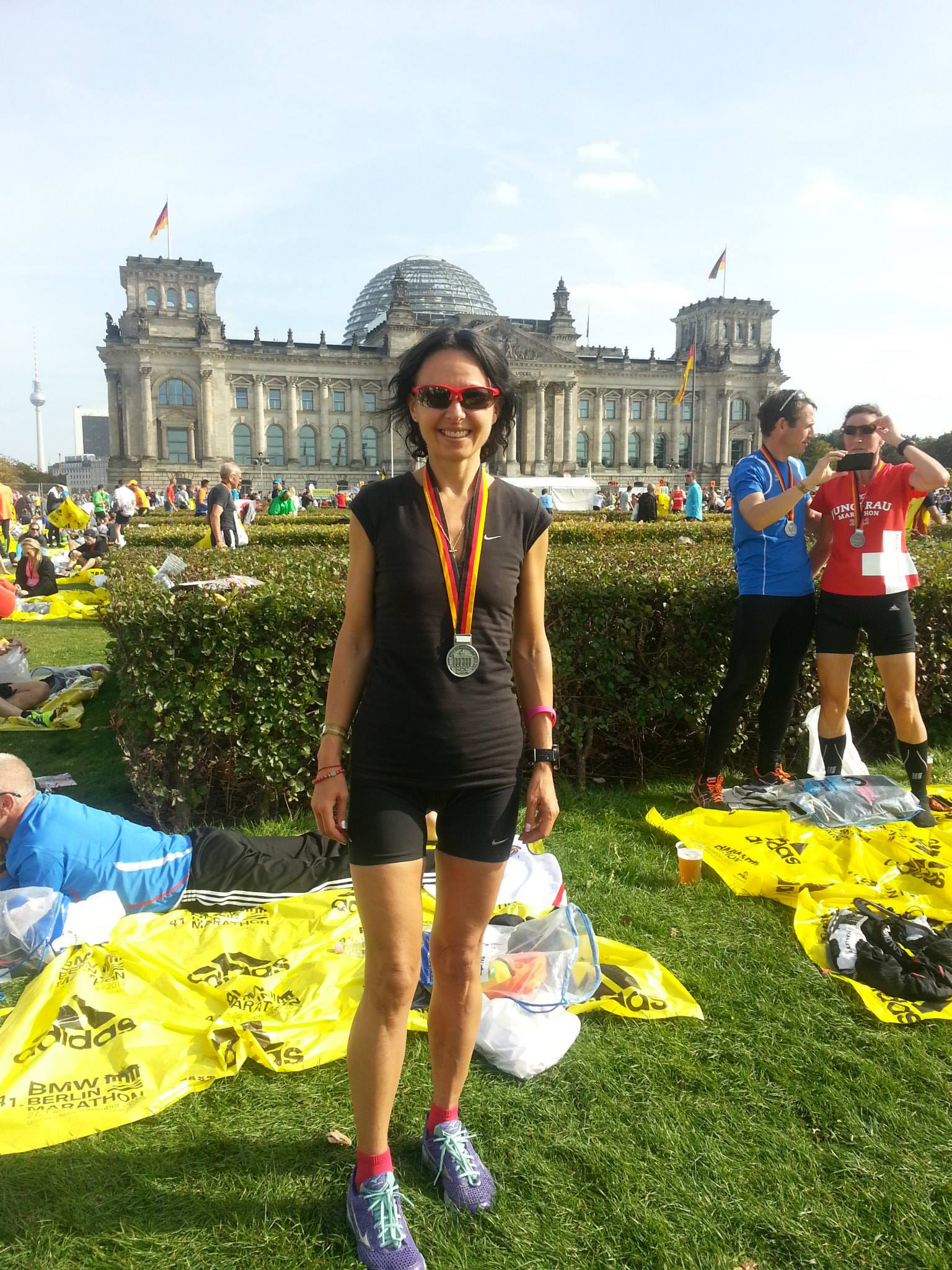 Didina: Maratonul de la Berlin, pe care l-am asteptat cu nerabdare tot anul trecut. Imi doream si un timp bun si am incercat sa ma concentrez doar pe alergarile pentru el. Cu o saptamana inaintea cursei, am participat la un semimaraton in cadrul Campionatului Balcanic de Atletism si de cum am pornit in alergare am simtit o durere in calcaiul drept, care m-a tinut toata cursa. Nu eram pregatita pentru un abandon, asa ca am incercat sa pun piciorul in diverse pozitii cand calcam, ca sa pot alerga. Consecintele au fost pe masura. Luni nu puteam merge, decat pe varful piciorului; de marti am incercat usor-usor sa merg. Joi am incercat o alergare usoara, dar tot mai aveam durere, asa ca eram resemnata pentru Berlin, care urma peste 3 zile; ma gandeam ca macar sa ma pot bucura sa termin cursa in limita timpului. Duminica, inainte de inceputul cursei, am avut emotii, cum se va manifesta piciorul meu; am pornit cu grija si usor; durerea nu a mai aparut. Eram insa relaxata si linistita, fara sa ma intereseze target-ul la care visam. Mi-am bucurat sufletul in alergare, alaturi de toti cei care ne-au sustinut pe traseu, am interactionat cu ei si nu am simtit cand s-a apropiat de sfarsit cursa. La final, cand am ridicat privirea la cronometrul oficial, nu mi-a venit sa cred ca visul meu s-a implinit! Imi doream sa termin in 3:30 si am termina in 3:28:58! Nu pot descrie momentele acelea, doar ca, inca o data, mi-am spus ca viata este un miracol.