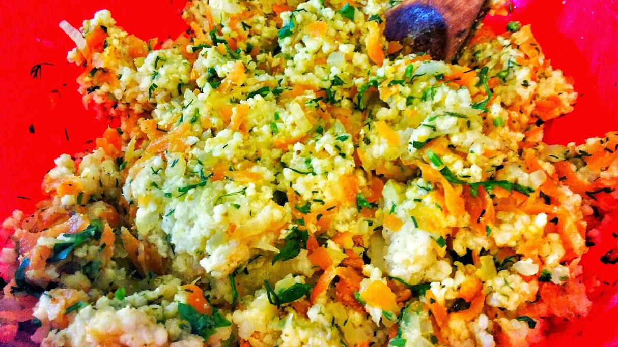 Ciupercile se curata, se spala si se taie bucatele. Se pun intr-o cratita sau intr-o tigaie, la foc mic, pana ce lasa apa, apoi se adauga ceapa, taiata cubulete. Se lasa la foc mic, pana ce apa din legume s-a evaporat. Cat stau ciupercile si ceapa pe foc, se marunteste verdeata, se adauga condimentele si se amesteca totul intr-un bol generos. Dupa ceĀ oprim focul, adaugam la verdeata, ciupercile si ceapa, impreuna cu vreo 5 linguri de faina integrala, pentru omogenizarea compozitiei. Am uitat, dar ar fi mers si vreo 2 lingurite de turmeric. Nu doar pentru calitatile sale, dar si pentru culoarea pe care o da preparatelor culinare. Si ar fi mers si morcov ras, dar timpul a fost scurt. š