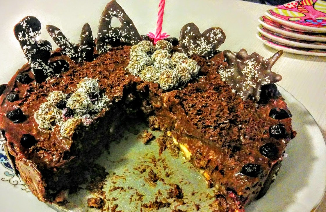 Apoi, cu grija, pentru a nu strivi fructele, am adaugat crema ciocolatoasa, niveland cu spatula. Am pus tortul in congelator, pana a doua zi. Apoi am pregatit decorul din cateva patratele de ciocolata (85% cacao, fara lapte ori zahar) astfel: am topit ciocolata la bain marine, iar Gia s-a jucat cu imaginatia, desenand pe o hartie de copt litere si forme. Le-am stropit cu fulgi de cocos si le-am pus si pe ele la congelator.